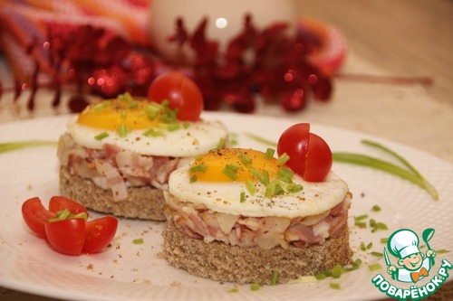 Приступаем к оформлению тартара:на основание из хлеба выкладываем бекон с луком, сверху выкладываем яйцо. Посыпаем черным молотым перцем, зеленым луком, выкладываем помидоры черри. Наш тартар готов! Приятного аппетита!