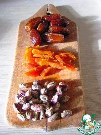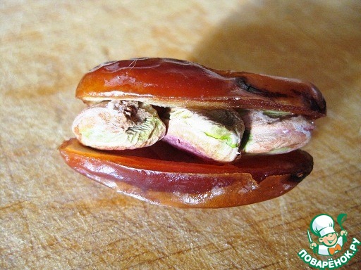 Почистим фисташки. Удалим косточки из фиников и нарежем полосками курагу.