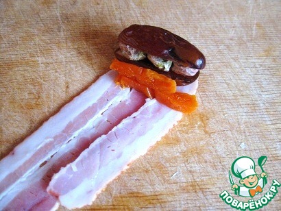 Полоску бекона разрезать на две части. Положить финик на край полоски и добавить полоску или две кураги.