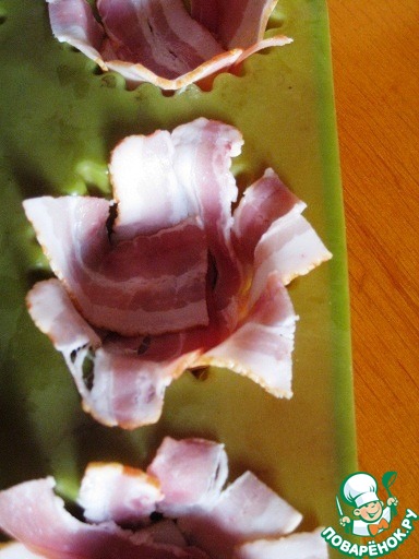 Нарезать оставшиеся 5 полосок бекона на 3 части каждую и уложить в формочки, так чтобы получилась импровизированная корзинка. Поставим в духовку на 10 мин. при 175 град. (ориентируйтесь по своей духовке)