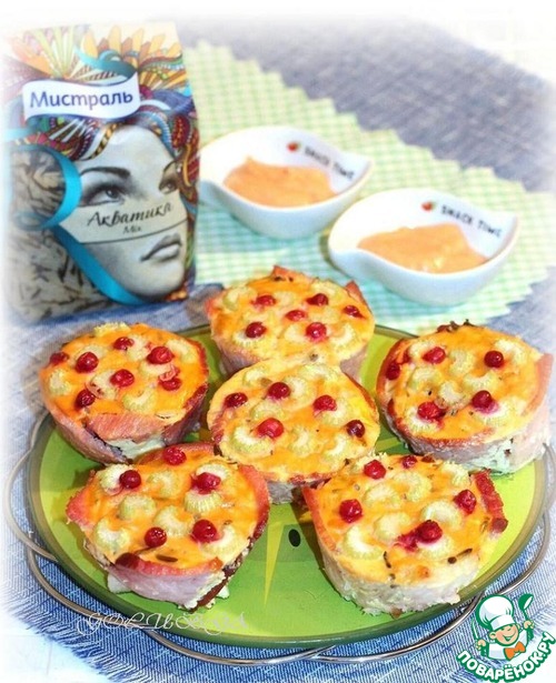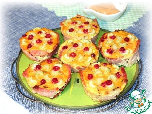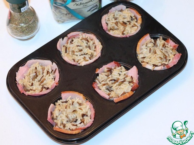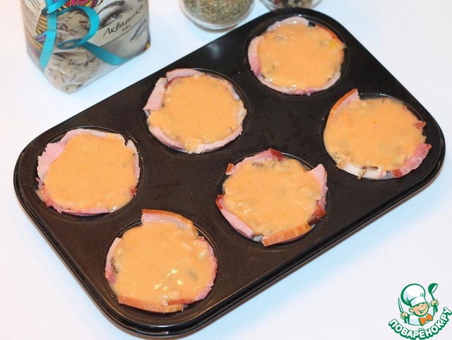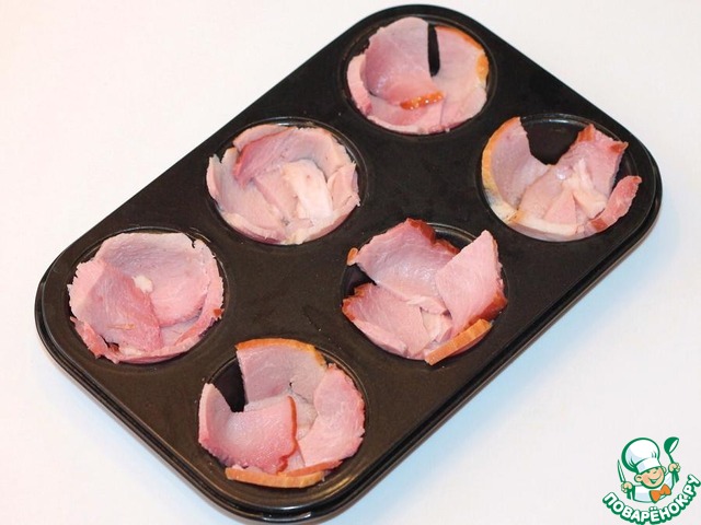 Разогреваем духовку до t 190 С. Достаем формочки для выпечки, лучше силиконовые, их не надо смазывать маслом. В каждую ячейку раскладываем бекон.