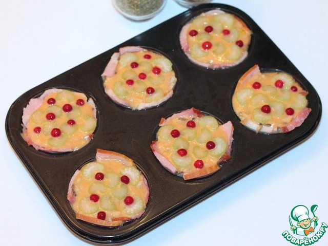 Можно сверху добавить нарезанные овощи. У меня тонко нарезанный сельдерей. Сверху немного посыпано брусникой. Ставим формочки в хорошо разогретую духовку. Запекать корзиночки при 180'C до полной готовности яиц, 15-20мин.
