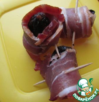 Начинить каждую черносливину кусочком сыра, завернуть в полоску бекона и закрепить деревянной зубочисткой. Такие вот штучки получились.