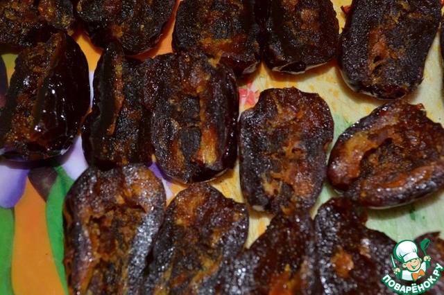 Как я уже писала, финики желательно брать не такие как у меня (они очень мясистые и фарша много внутрь положить не получилось.) У меня фарш остался ( примерно третья часть).