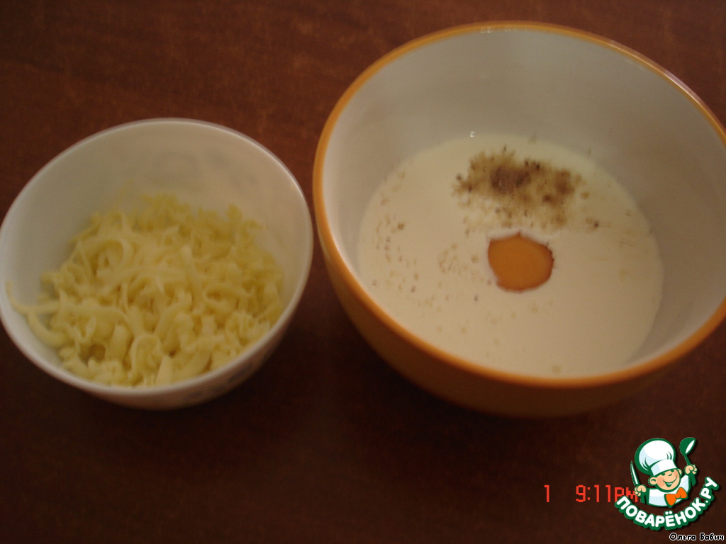 В сливки добавить яйцо, взбить венчиком, добавить душистый перчик, соль.