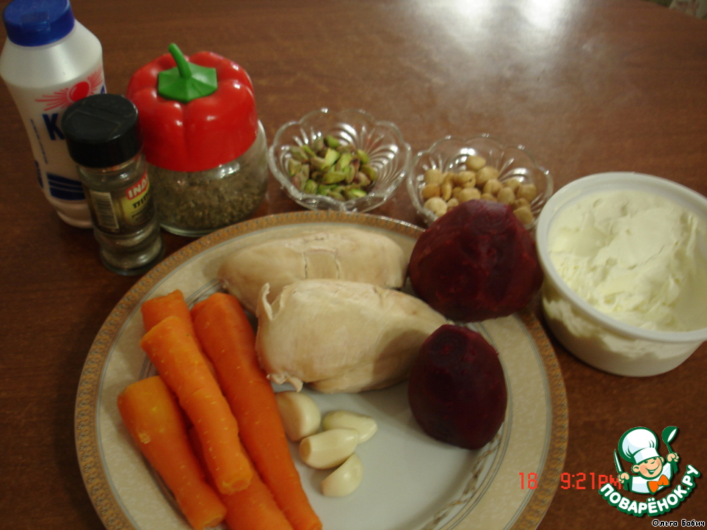 Необходимые продукты (куриная грудка, морковь, свекла, специи, орехи (миндаль перемолола позже), чеснок, густая сметана или крем-фреш.