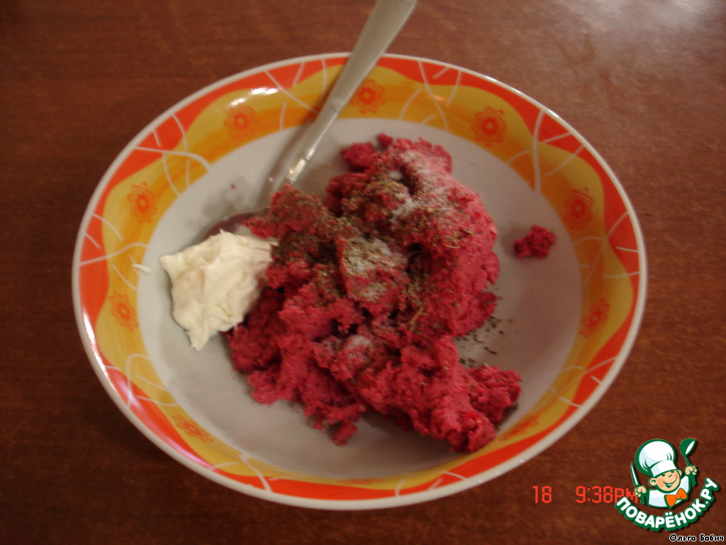 Для приготовления черешенки: перемолоть в блендере половинку грудки с чесноком (2зуб.) и свеклу (у меня свеклы ушло меньше).