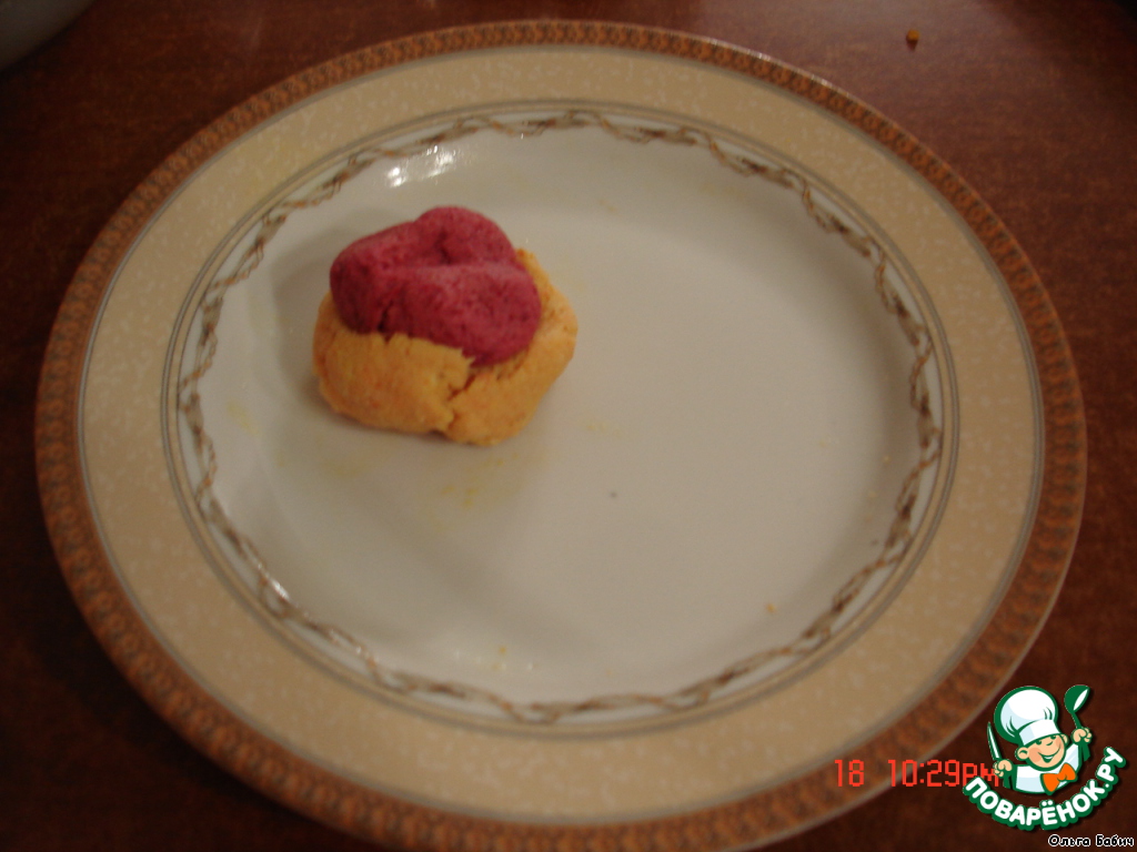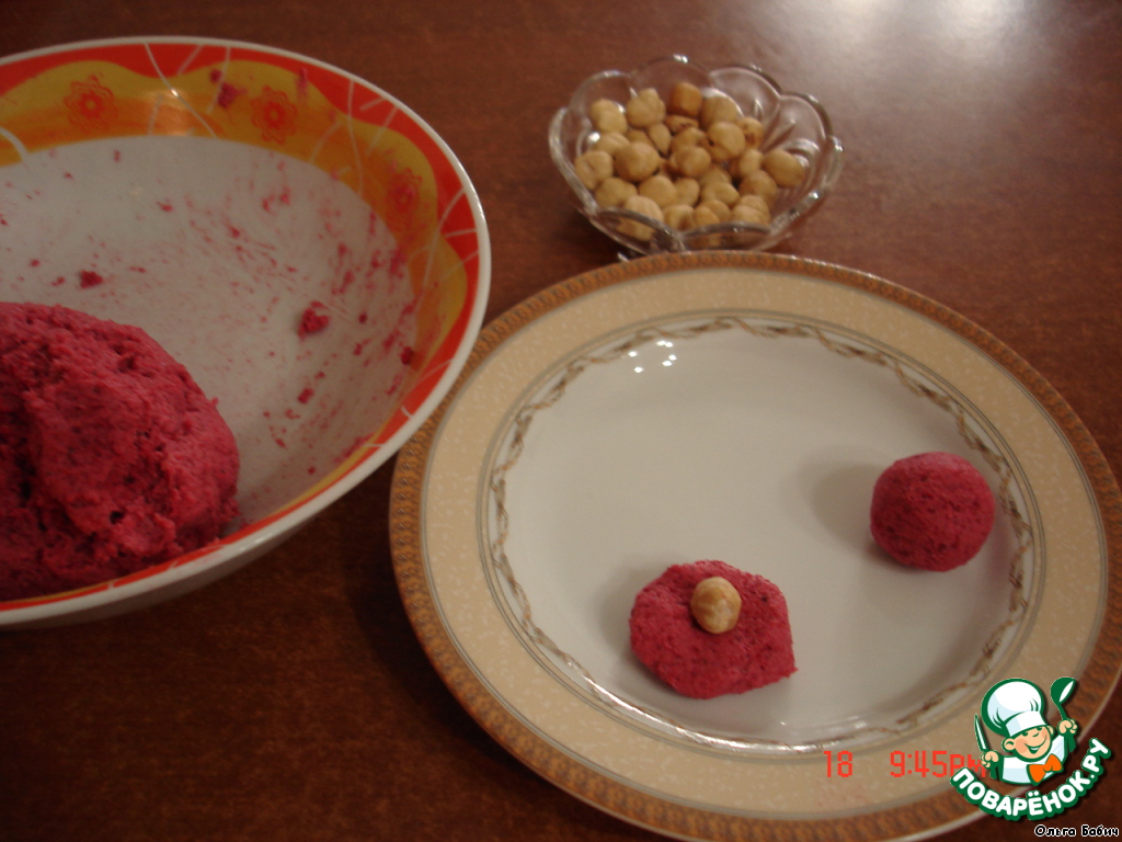 Из полной чайной ложки приготовленной массы делаем лепешку, укладываем орешек.