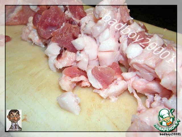 Итак, мясо вместе с салом режем на кусочки примерно от 1 до 2 сантиметров.