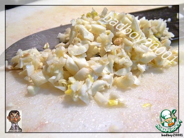Нарежем очень мелко чеснок (можно и на терке, но ведь готовим для себя и для кошки)...