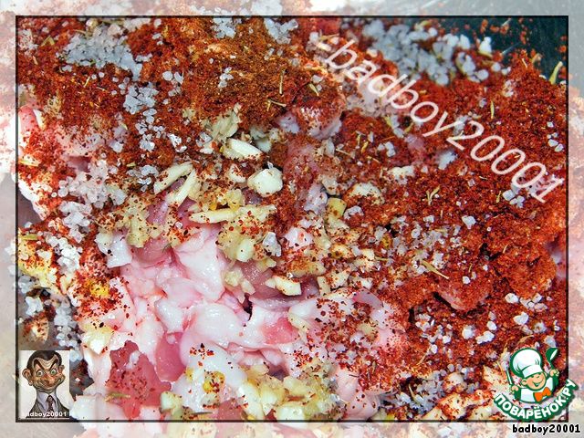 В нарезанное мясо добавляем пару столовых ложек сладкой красной паприки, половинку чайной ложечки горькой паприки, молотые зерна кориандра, мелко нарезанный чеснок и по вкусу соли и черного перца.