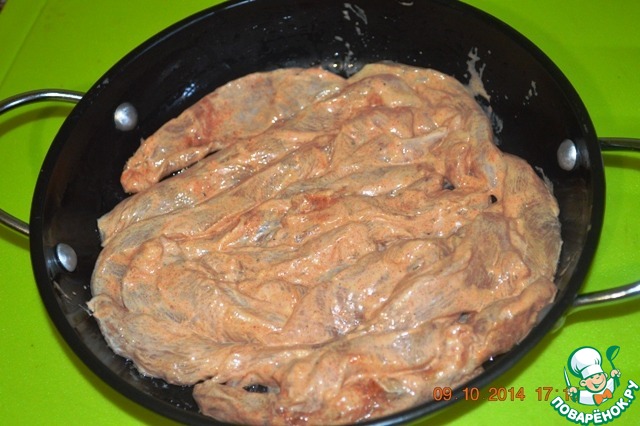 Выложить по одной наши полоски (лучше, конечно, если они будут находиться на некотором расстоянии друг от друга). я готовила на 1 порцию, поэтому и сковороду взяла маленькую, в идеале это должен быть противень