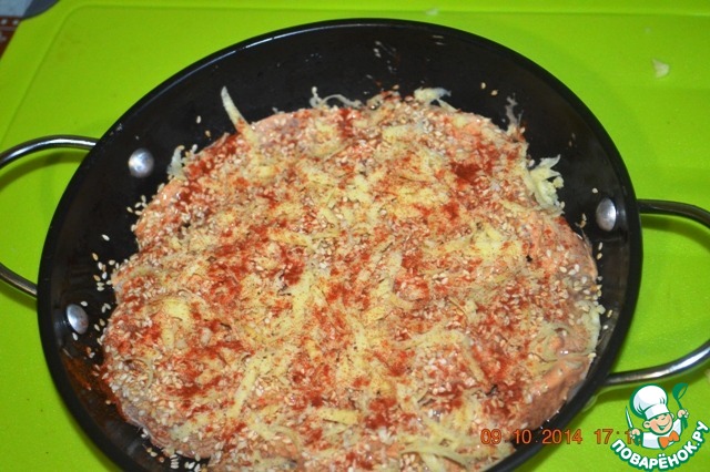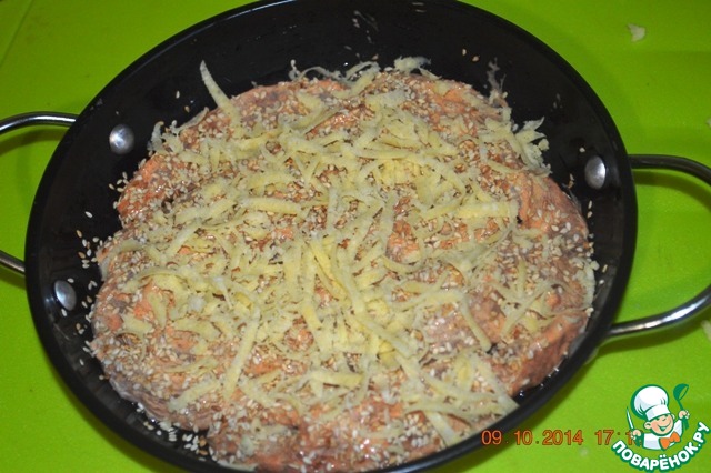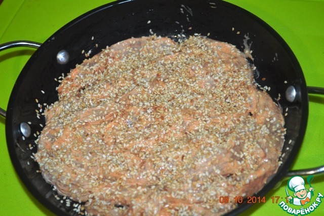 Посыпать кунжутом (предварительно кунжут обжарить на сухой сковороде до чуть золотистого цвета)