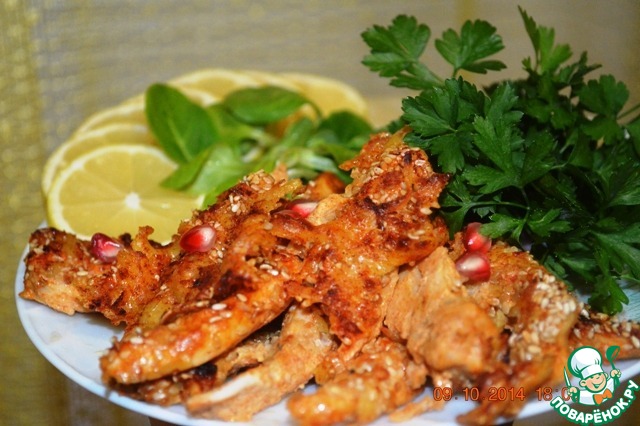 | Свой 13 рецепт решила посвятить закусочным палочкам с кунжутом. Готовятся на раз-два-три, что согласитесь немаловажно, когда появляются неожиданные гости, да и на любой праздник готовить их удобно и быстро. Можно готовить из любого мяса, и набор продуктов такой, что всегда есть под рукой. Вначале планировала сделать полоски из свинины, но в холодильнике оказались только куриные грудки. Заранее извиняюсь, если подобный рецепт есть на сайте, вчера, когда забивала в поисковике "мясо, кунжут" - совпадений не показало. Блюдо делала как показательное, поэтому все ингредиенты рассчитаны на 1 порцию. Рецепт взят с сайта www.cooksa.ru. |