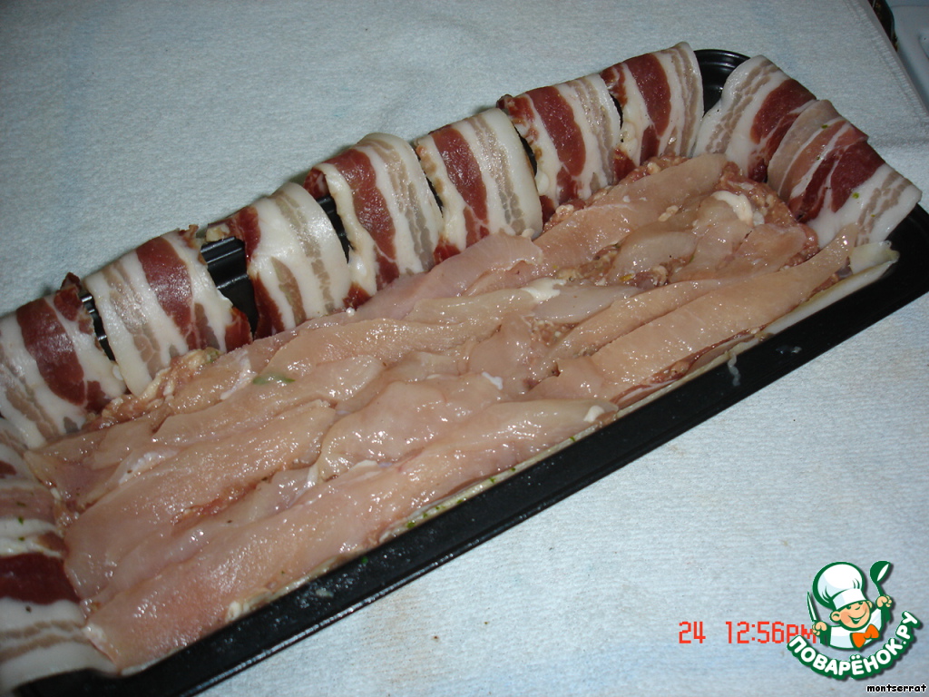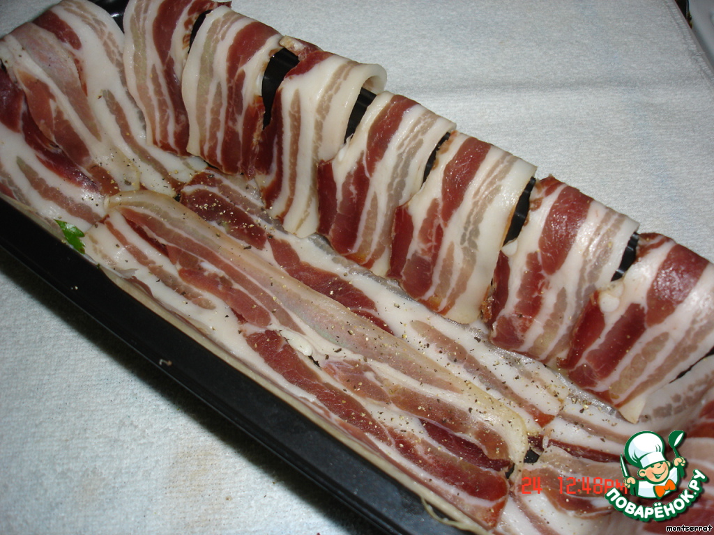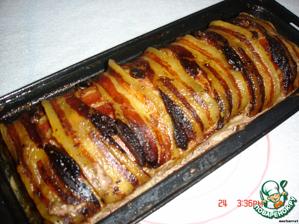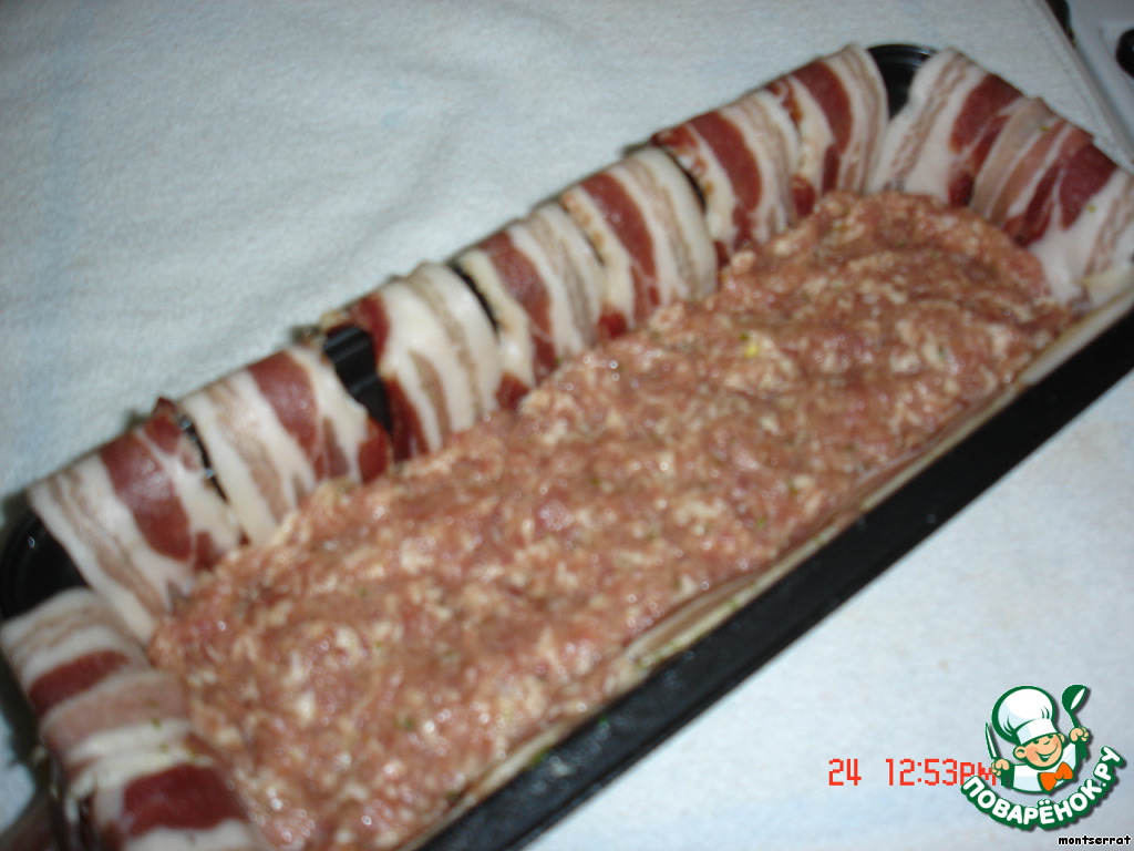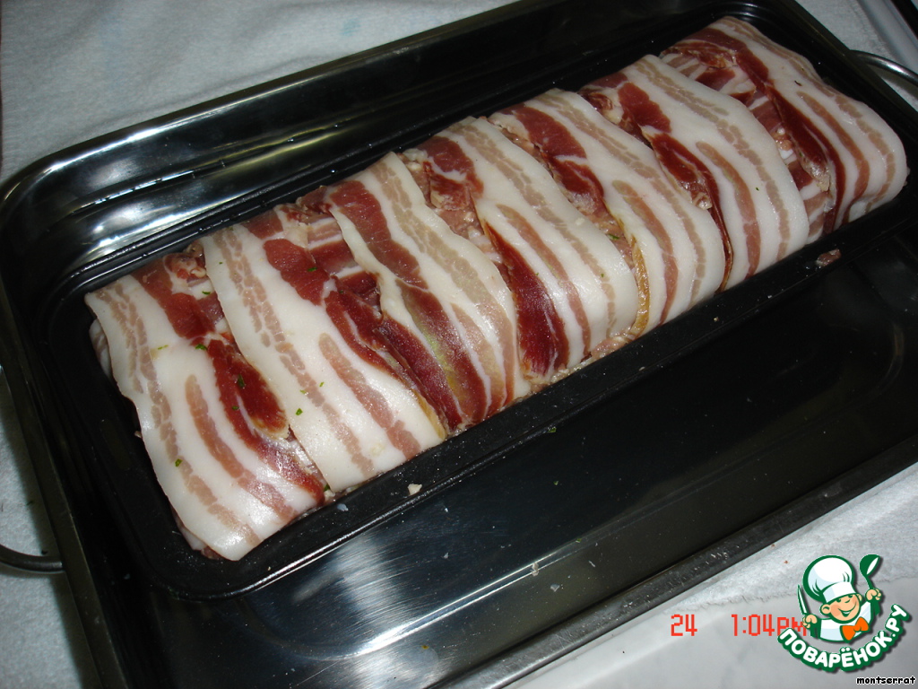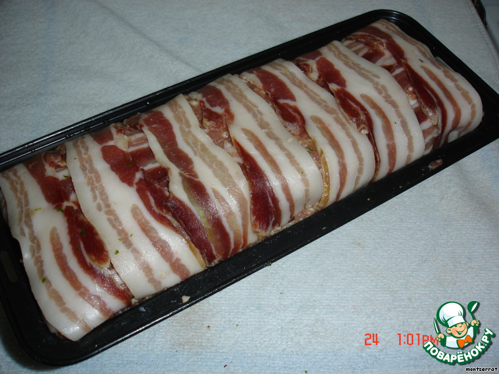 Заполняем форму остальным фаршем и укутываем полосками бекона.