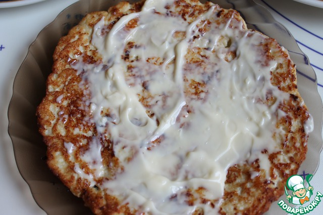 Готовые лепешки выкладываем на тарелки и смазываем сразу горячими майонезом смешаным с чесноком.