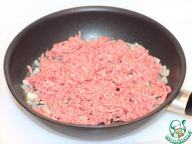 К луку добавляем домашний фарш, обжариваем его на среднем огне, разбивая комочки, он должен стать по цвету серым.