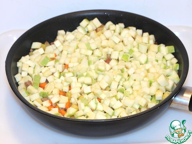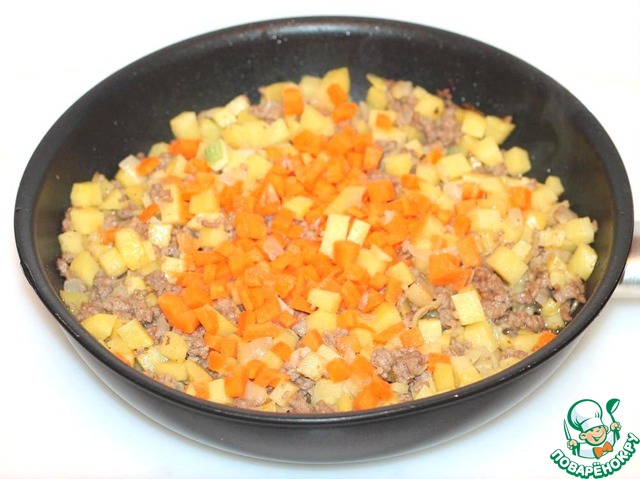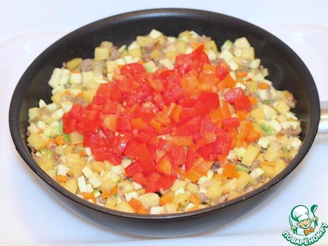 Все эти овощи будем поочерёдно добавлять к мясу с интервалом в 2 минуты. В конце добавляем сухую приправу, солим, перчим и кладем кубики помидора с перчиком. Добавляем 2-3 ст. л. воды и тушим на среднем огне до полного испарения влаги. Начинка готова.