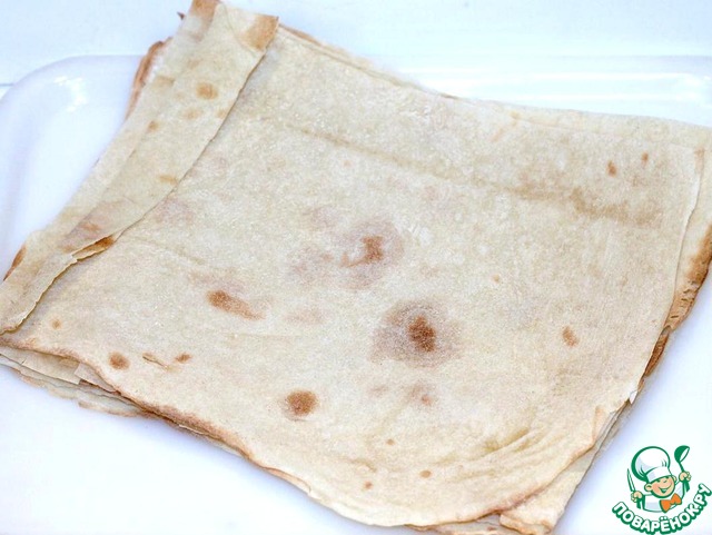 В оригинальном рецепте для этого блюда нужно испечь тонкие блинчики, но я выбрала более лёгкий и практичный путь и заменила блинчики на лаваш. Получилось менее калорийно, но очень вкусно и сытно.