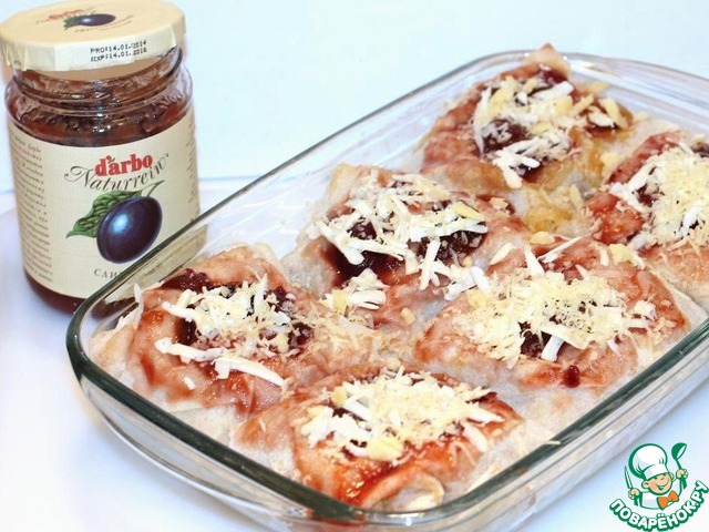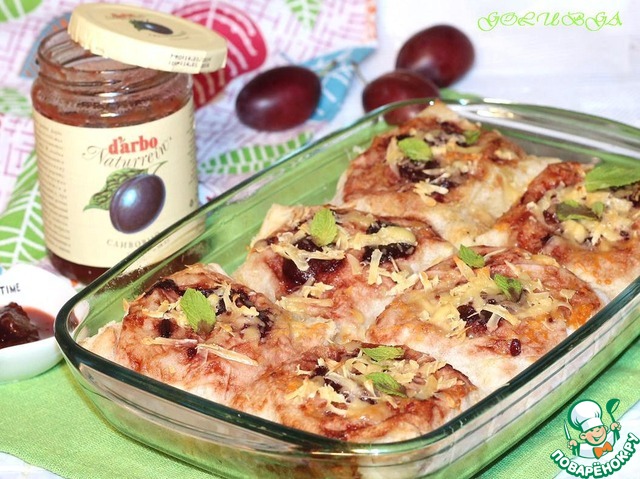 Мешочки из лаваша с мясом и овощами под сливовым соусом