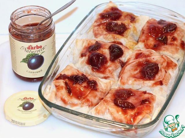 переворачиваем и укладываем в форму, смазанную маслом. Смазываем сливовым соусом верх мешочков.