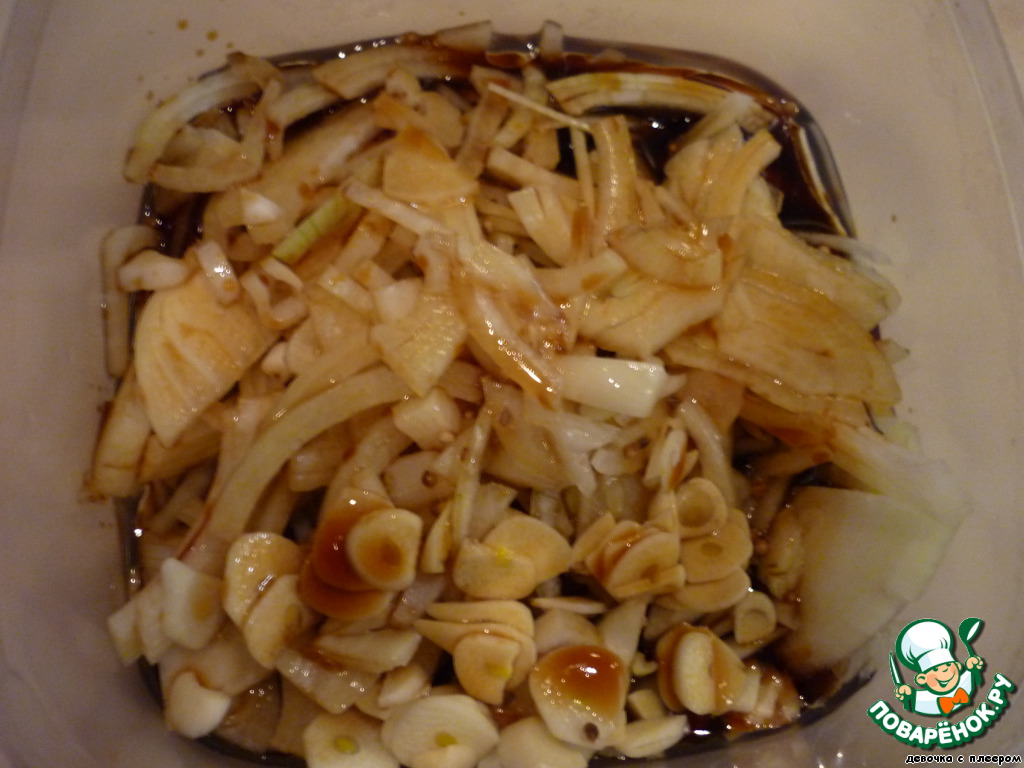 Смешать лук,чеснок, кориандр, соевый соус и растительное масло (соль не надо!!)