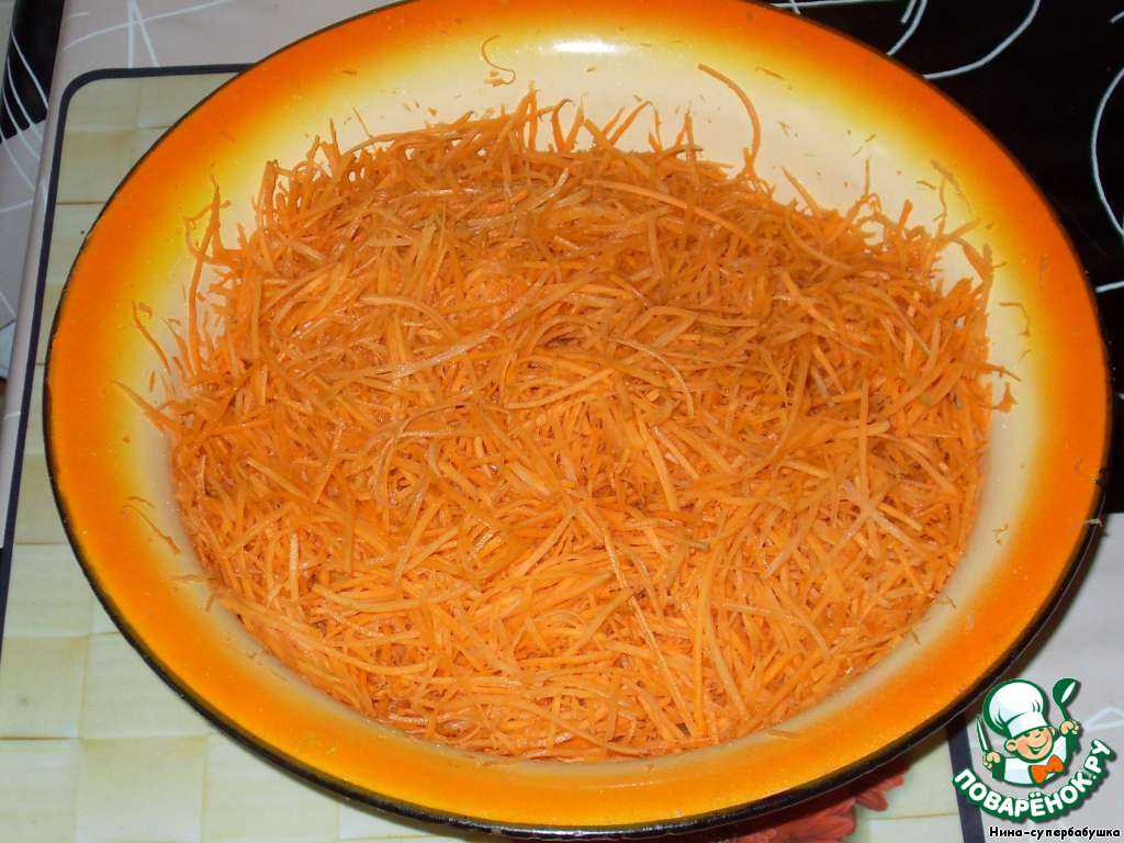 Морковь очистить и натереть на терке для корейской моркови. Присолить и отставить.