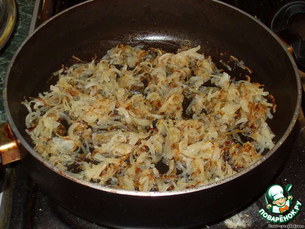 Лук нарезать полу- или четвертькольцами и обжарить в растительном масле до красивого золотистого цвета. Выложить лук в мисочку.
