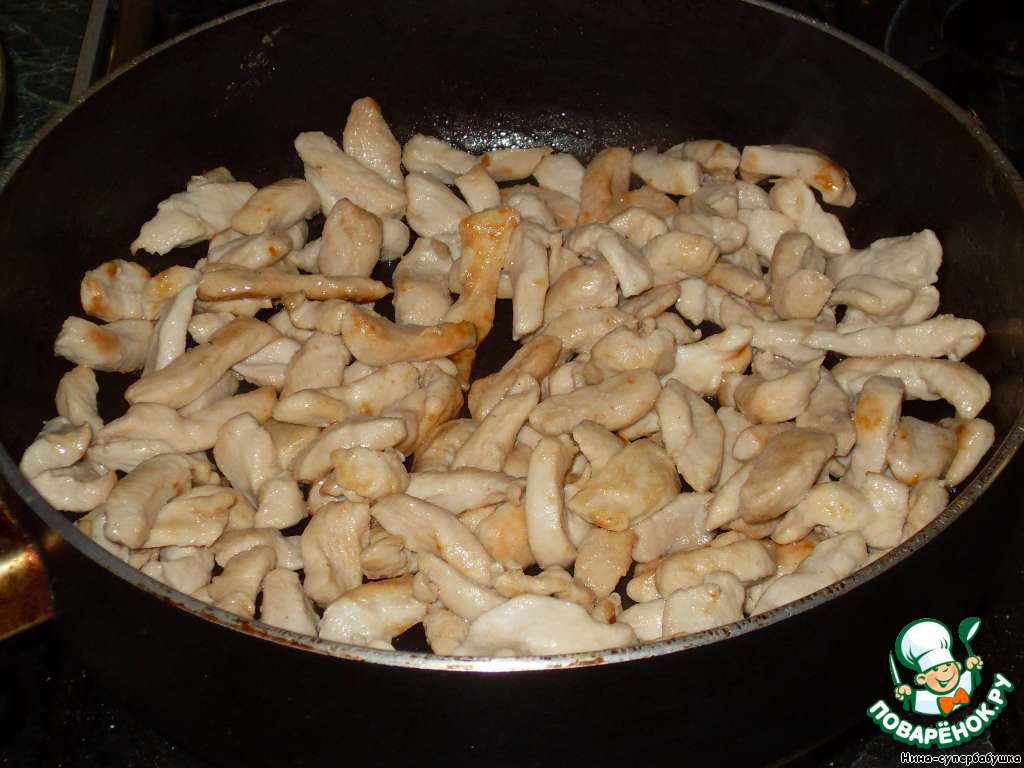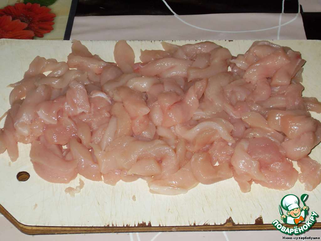 Мясо нарезать тонкими полосками.