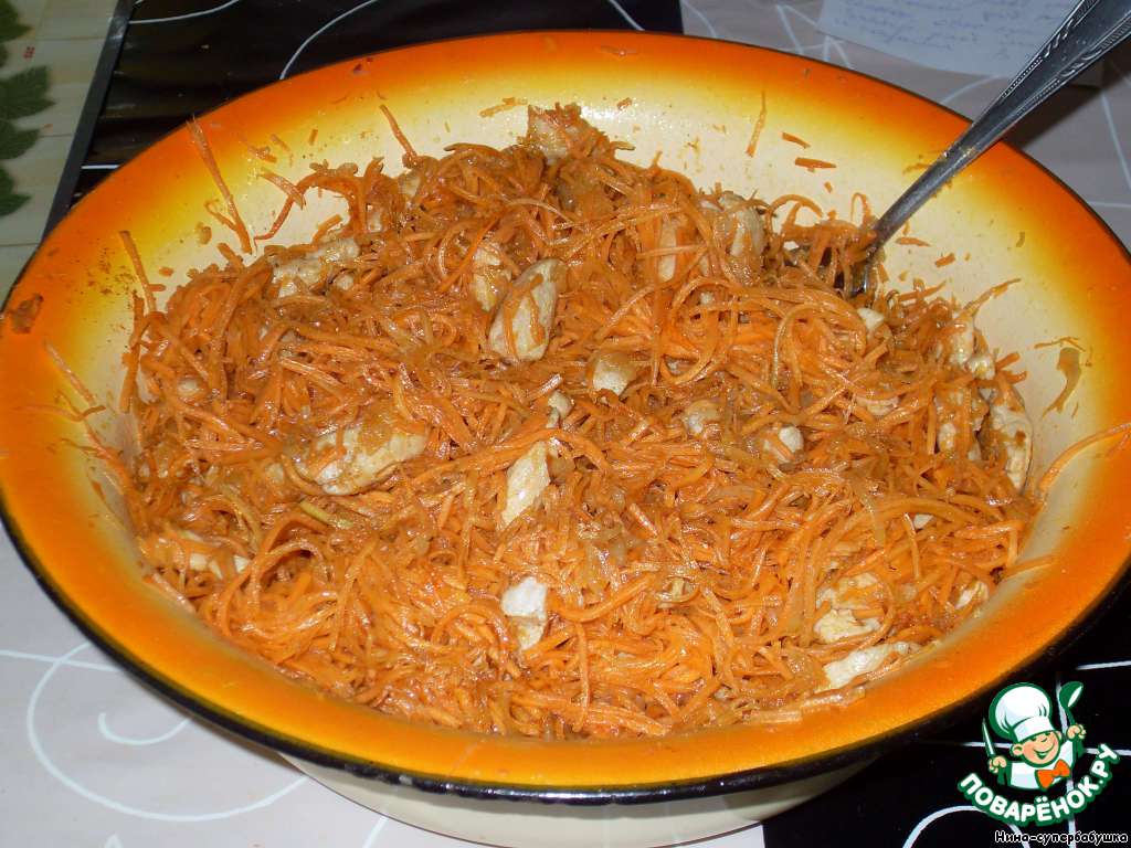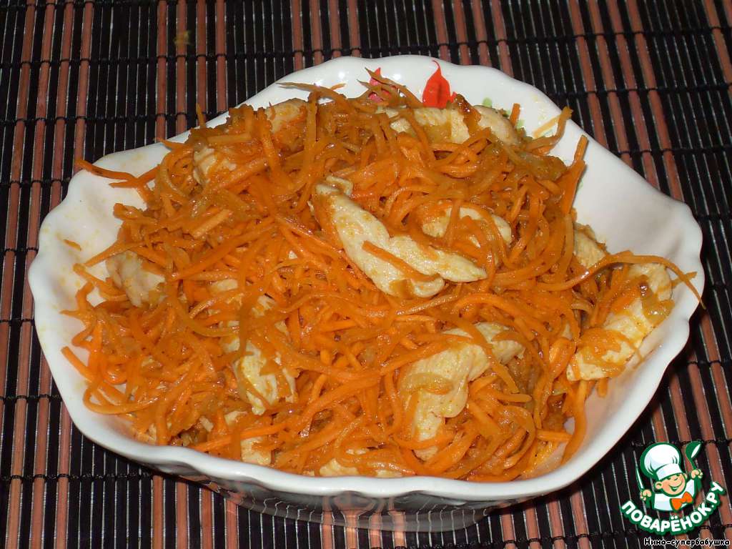 | На первый взгляд может показаться, что это морковь по-корейски. На самом деле похоже только внешне. Рецепт совершенно другой. Гораздо проще, а получается нисколько не хуже. Очень вкусная вещь. Ингредиенты можно варьировать. Я готовила это блюдо с куриным филе, со свининой и даже с кальмарами. Все три варианта очень хороши. Мнения в семье разделились: мне больше всего нравится с курицей, дочке - с кальмарами, а мужу и сыну нравятся все три варианта!!! |