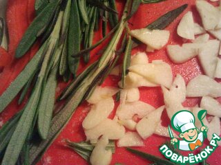 Чеснок чистим и режем пластинами. С розмарина обрываем листики. Мне попался розмарин с очень крупными листочками, которые пришлось даже порвать на 2-3 части.