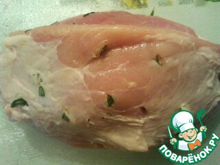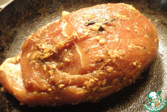 В свинине тонким ножом делаем надрезы, нашпиговываем их розмарином и чесноком