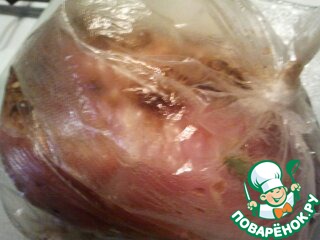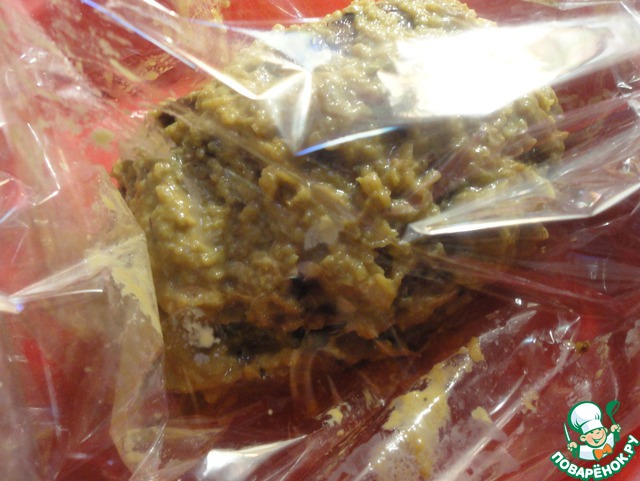 Туда же заливаем маринад-эмульсию. Завязываем пакет, хорошо перетряхиваем, чтобы маринаад равномерно распределился по мясу. Отправляем в холодильник часов на 8. У меня мясо лежало ночь. По возможности - периодически перетряхиваем.