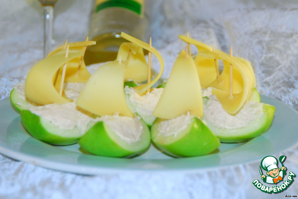 В каждую яблочную лодочку кладем начинку, кусочек сыра надевем на зубочистку в виде паруса и втыкаем в лодочку. Выкладываем на тарелку, можно украсить свежей зеленью по желанию.