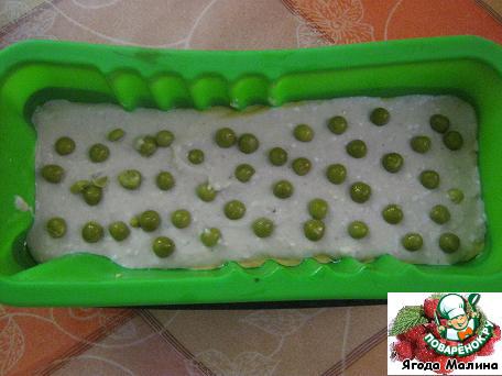 В форму выложить половину массы с карри и куркумой, посыпать горошком, накрыть остатками этой смеси. Повторяем тоже самое со второй частью. У меня форма силиконовая, если нет таковой, то можно использовать пакет из под молока, который выстелить пищевой плёнкой.