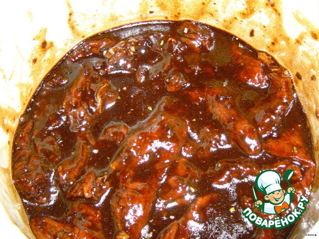 Взбейте растительное масло, соевый соус и измельченный чеснок, смешайте с мясом и маринуйте 1 час в холодильнике.