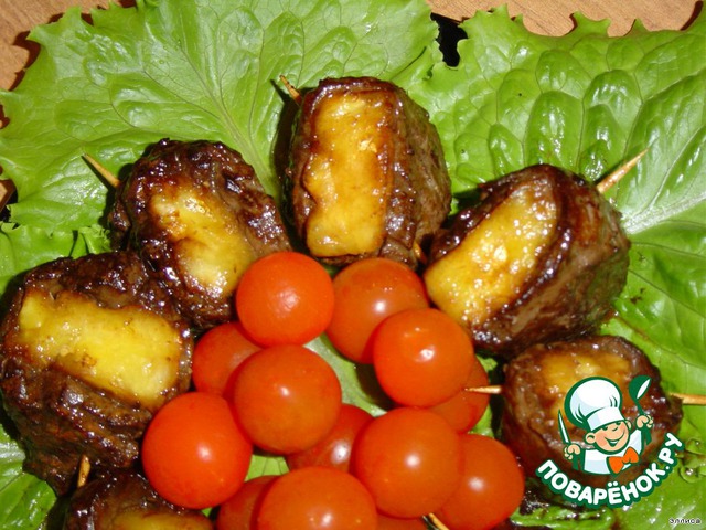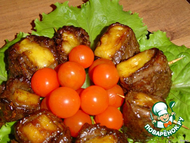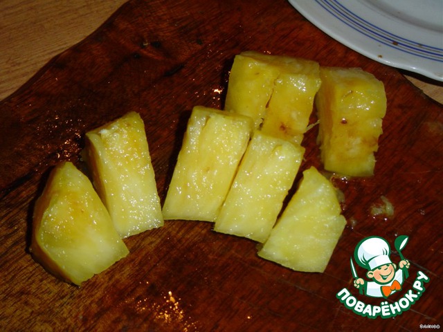Очистите ананас от кожицы и нарежьте кубиками по 1 см. Оберните каждый кубик ананаса полоской мяса и скрепите зубочисткой. Жарьте в духовке 2 минуты при температуре 270 гр. , переверните и жарьте еще 2 мин.