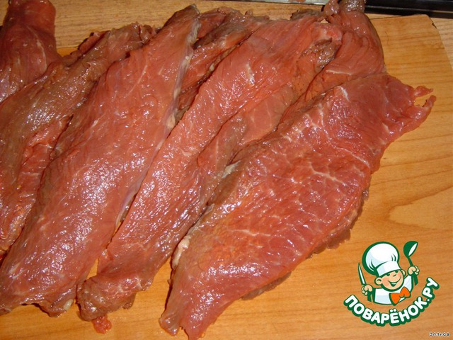 Говядину тонко нарежьте поперек волокон полосками шириной в 1 см. Немного отбейте.