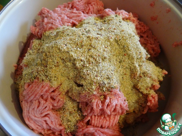 Высыпать специи в фарш и мешать, постепенно добавляя ледяную воду, до поглощения всей свободной влаги и получения однородной липкой консистенции;