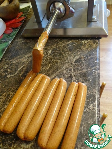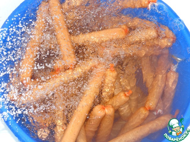 Готовые сосиски быстро охладить под холодным душем и убрать в холодильник на 6-8 часов до полного остывания (затем часть сосисок можно отправить в заморозку);