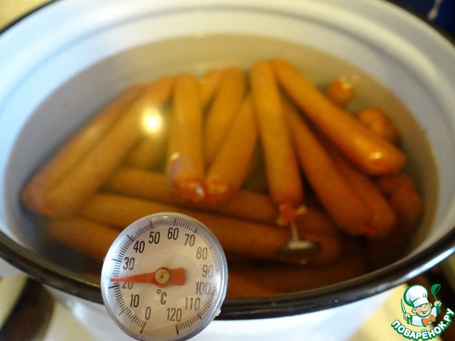 Далее варить при температуре 70-75 градусов до достижения температуры внутри сосиски — 66-68 градусов (ВАЖНО!!! Температуру воды поднимать очень медленно — в течении 3-х часов);