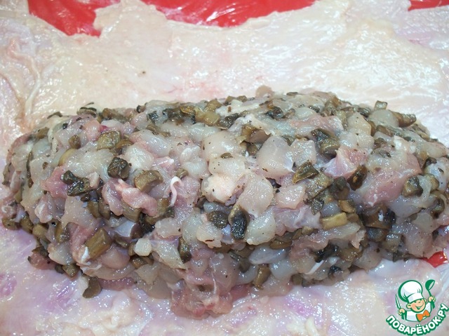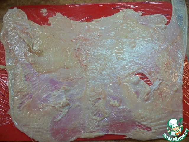 Запасаемся очень острым ножом и с подготовленной курицы снимаем аккуратно кожицу, стараясь ее не повредить, поскольку именно в нее мы будем заворачивать смесь мяса и грибов. Вот так приблизительно должно у вас получиться.