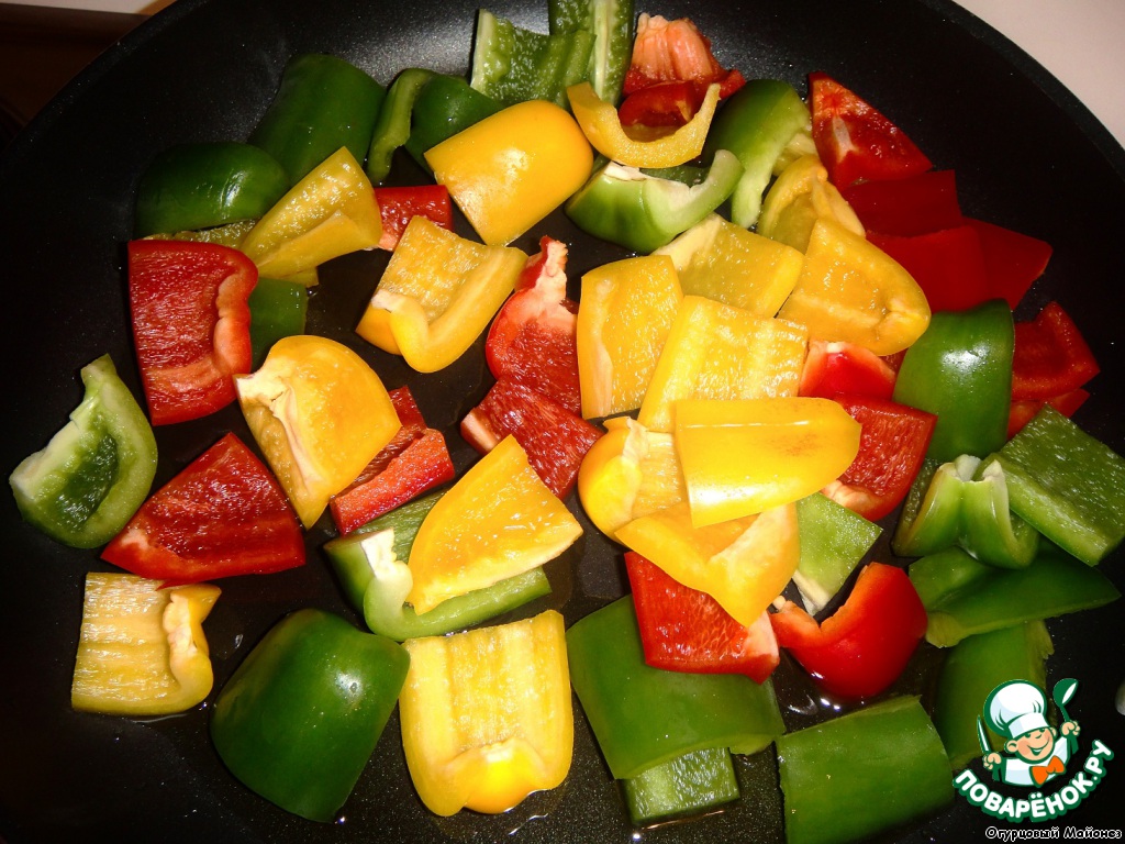 Сладкий перец очищаем от семян и нарезаем на кусочки, примерно равные кусочкам мяса. Обжариваем на растительном масле до румяной корочки и перекладываем в отдельную посуду.