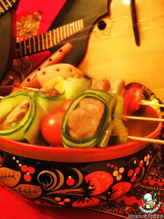 Нанизываем на шпажку перец, мясо в огурце и помидор черри.