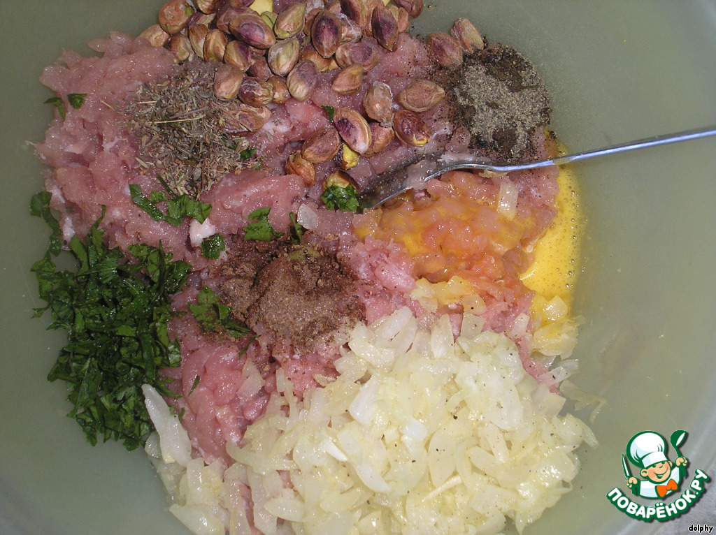 Добавьте тимьян, петрушку, фисташки, коньяк, душистый перец, соль и перец, желтки и лук с чесноком. Тщательно вымешайте фарш руками.