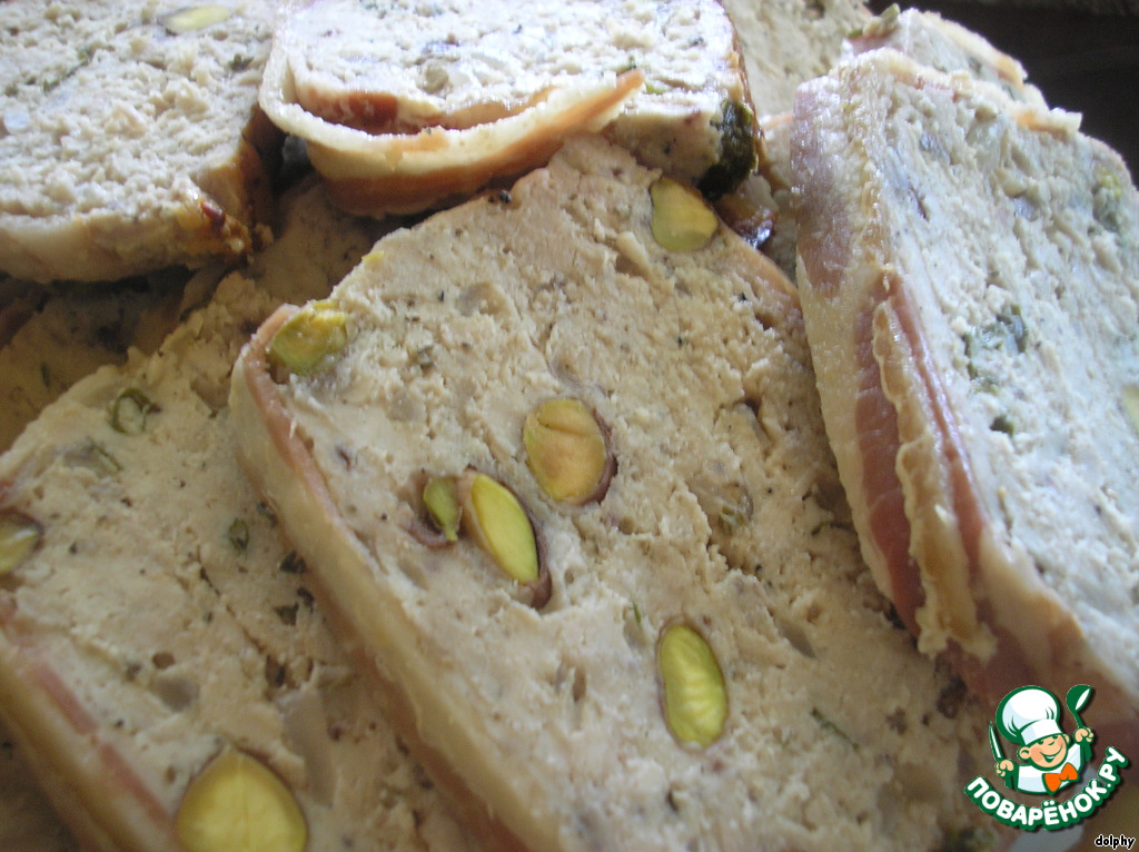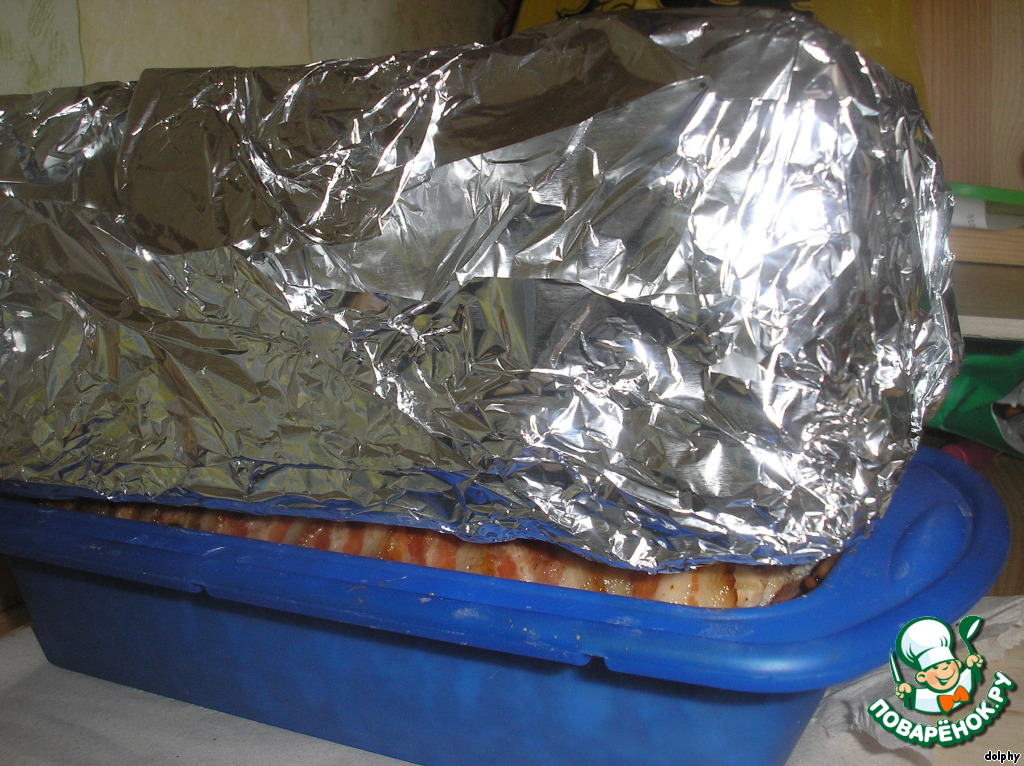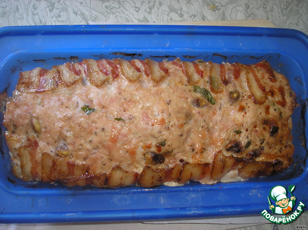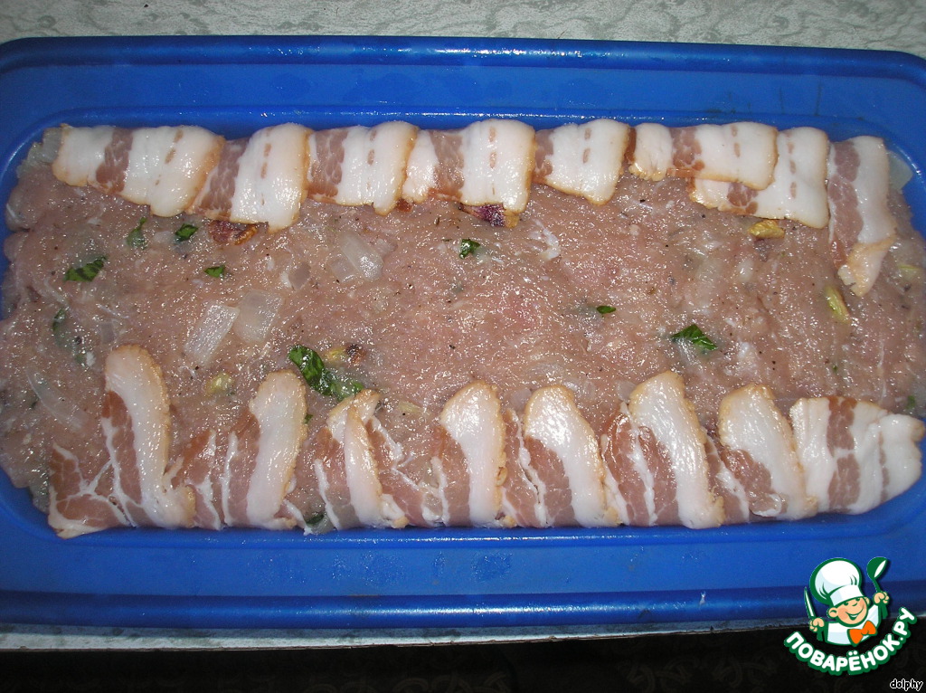 Выложите фарш в вашу форму, утрамбовывая его. Накройте сверху свисающими полосками бекона. Если бы у меня было достаточно бекона, то террин можно было бы обернуть им полностью.