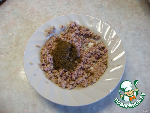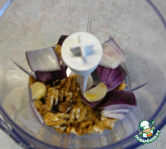 Для заправки измельчаем: грецкие орехи + лук +чеснок.
