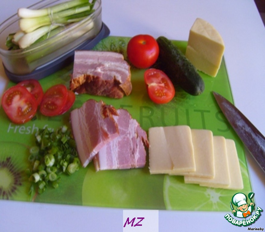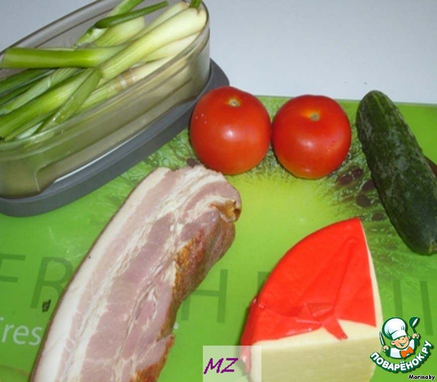 Режем на кусочки одинаковой величины грудинку, сыр сулугуни, кружочками помидор, зеленый лук.