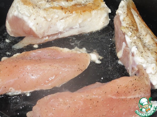 Филе посолить, поперчить и обжарить на оливковом масле по паре минут с каждой стороны, затем на 8 - 10 минут убрать в разогретую до 180 гр. духовку.