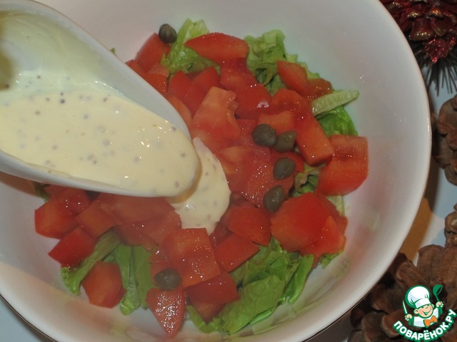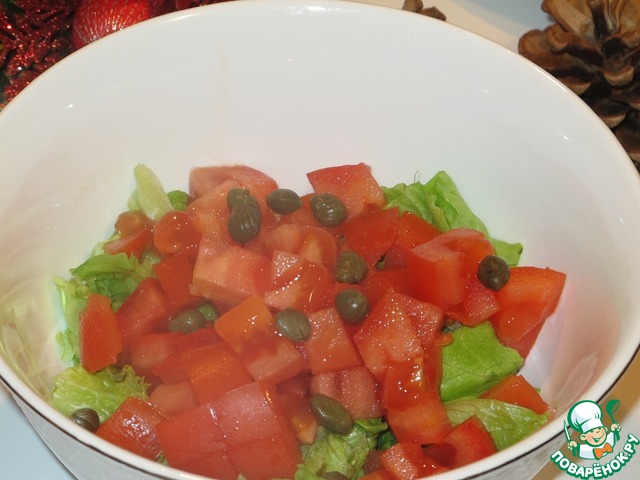 Листья салата порвите руками, помидоры крупно нарезать. Смешайте, добавьте каперсы, посолите, поперчите.